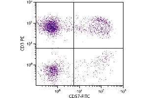 CD57 represents a 100 kDa oligosaccharide antigenic determinant present on a variety of polypeptides, lipids and chondroitan sulfate proteoglycans. It is expressed on 7-35 % of normal peripheral blood lymphocytes, including subsets of NK cells and CD8+ T lymphocytes. The function of CD57 is unknown.