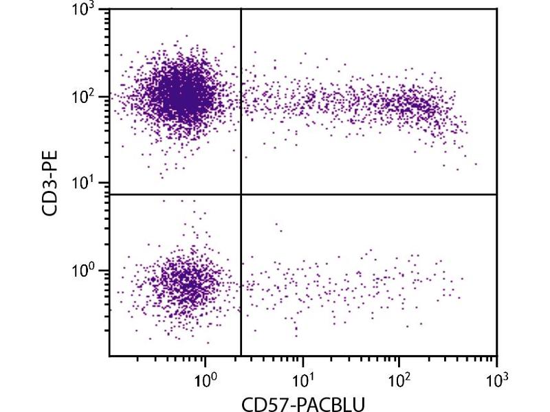 CD57 represents a 100 kDa oligosaccharide antigenic determinant present on a variety of polypeptides, lipids and chondroitan sulfate proteoglycans. It is expressed on 7-35 % of normal peripheral blood lymphocytes, including subsets of NK cells and CD8+ T lymphocytes. The function of CD57 is unknown.