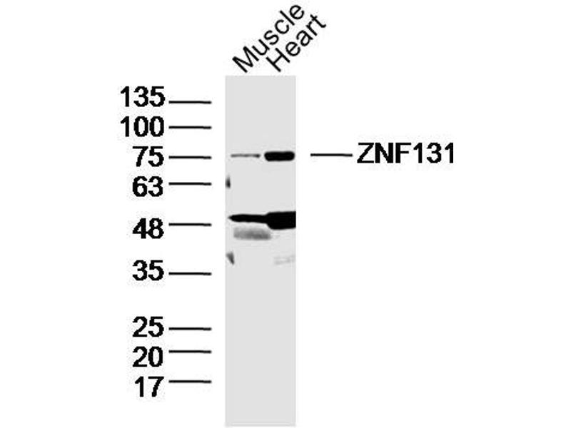 Background: Zinc-finger proteins contain DNA-binding domains and have a wide variety of functions, most of which encompass some form of transcriptional activation or repression. The majority of zinc-finger proteins contain a Kruppel-type DNA binding domain and a KRAB domain, which is thought to interact with KAP1, thereby recruiting histone modifying proteins. As a member of the krueppel C2H2-type zinc-finger protein family, ZNF131 (Zinc finger protein 131) is a 623 amino acid nuclear protein that contains one BTB (POZ) domain and six C2H2-type zinc fingers. With predominant expression found in brain, it is likely that ZNF131 plays a role as a transcription regulator during development and organogenesis of the adult central nervous system. ZNF131 also represses ER Alpha (Estrogen receptor alpha)-mediated transactivation by interrupting ER?binding to the estrogen-response element. There are two isoforms of ZNF131 that are produced as a result of alternative splicing events.