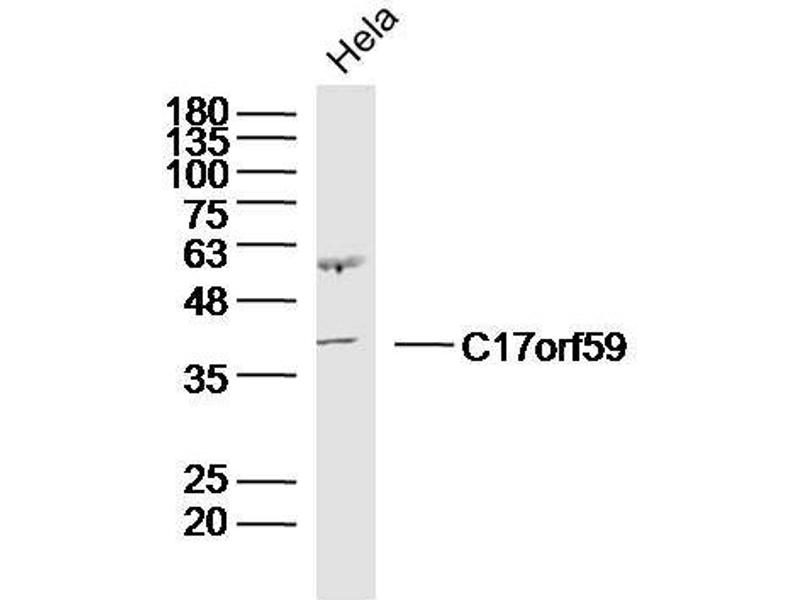 Background: C17orf59 is a 357 amino acid protein that is encoded by a gene mapping to human chromosome 17. Chromosome 17 makes up over 2.5 % of the human genome with about 81 million bases encoding over 1,200 genes. Two key tumor suppressor genes are associated with chromosome 17, namely, p53 and BRCA1. Tumor suppressor p53 is necessary for maintenance of cellular genetic integrity by moderating cell fate through DNA repair versus cell death. Malfunction or loss of p53 expression is associated with malignant cell growth and Li-Fraumeni syndrome. Like p53, BRCA1 is directly involved in DNA repair, specifically it is recognized as a genetic determinant of early onset breast cancer and predisposition to cancers of the ovary, colon, prostate gland and fallopian tubes. Chromosome 17 is also linked to neurofibromatosis, a condition characterized by neural and epidermal lesions, and dysregulated Schwann cell growth. Alexander disease, Birt-Hogg-Dube syndrome and Canavan disease are also associated with chromosome 17.