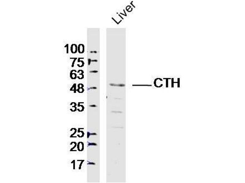 Background: Catalyzes the last step in the transsulfuration pathway from methionine to cysteine. Has broad substrate specificity. Converts cystathionine to cysteine, ammonia and 2-oxobutanoate. Converts two cysteine molecules to lanthionine and hydrogen sulfide. Can also accept homocysteine as substrate. Specificity depends on the levels of the endogenous substrates. Generates the endogenous signaling molecule hydrogen sulfide (H2S), and so contributes to the regulation of blood pressure.Defects in CTH are the cause of cystathioninuria (CSTNU). It is an autosomal recessive phenotype characterized by abnormal accumulation of plasma cystathionine, leading to increased urinary excretion.