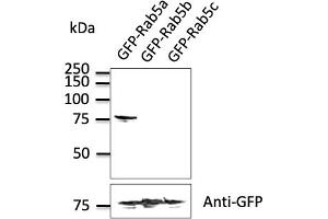 - Detects Rab5a protein by Western blot in cell lysates of transfected cells with GFP-Rab5a. This Ab is specific for Rab5a, it does not recognize Rab5b and Rab5c.