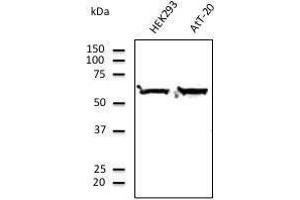 - This antibody gives a positive signal in the following human (293A, HMEC-1, U-118, HaCat), rat (TR-iBRB), mouse (AtT-20, Hepa), canine (D17) and monkey (COS-7) whole cell lysates.