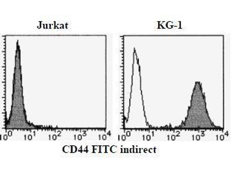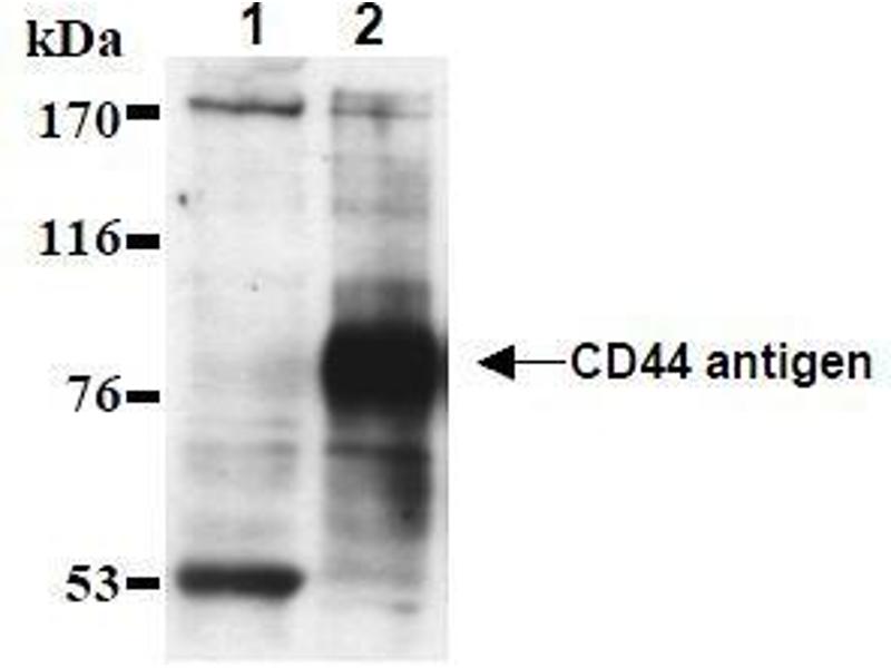 - CD44 (H-CAM/Pgp-1/Hermes antigen/ECMR-III/HUTCH-I) is a highly glycosylated transmembrane protein expressed by lymphocytes, fibroblasts, smooth muscle cells, and epithelial cells. CD44 functions as lymphocyte adhesion molecule, acting as a matrix receptor that mediates cell adhesion to the extracellular matrix. CD44 is also involved in T-lymphocyte activation, lymphocyte homing, cell migration, and hemopoiesis. Expression of CD44 on the cell surface changes profoundly during tumor metastasis, and the transition from non-metastatic to metastatic tumor cell variants is associated with expression of CD44 variants (CD44v's), making CD44 a potential cancer marker. CD44 has a predicted molecular weight of 85-90 kDa, but glycosylation can increase the apparent to ~200 kDa.Synonyms: CDw44, ECMR-III, Epican, Extracellular matrix receptor III, GP90 lymphocyte homing/adhesion receptor, HUTCH-I, Heparan sulfate proteoglycan, Hermes antigen, Hyaluronate receptor, LHR, MDU2, MDU3, MIC4, PGP-1, Phagocytic glycoprotein 1