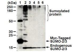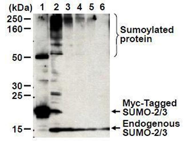 Sumoylation, the covalent attachment of a small ubiquitin-like modifier (SUMO) peptide to lysine residues of targeted substrate, has recently emerged as an important mechanism in transcriptional control. In humans and mice, the SUMO family consists of three members, SUMO-1, -2, and -3. SUMO-2 (SMT3A, Sentrin-3) and SUMO-3 (SMT3B, Sentrin-2) are similar (~95 % identical), but less closely related to SUMO-1 (~50 % identical). Whereas many proteins modified by SUMO-1 were identified, many as yet unidentified proteins are modified by SUMO-2/3 after exposure of cells to various stress stimuli.Synonyms: HSMT3, SMT3 homolog 2, SMT3A, SMT3H2, SUMO-3, Sentrin-2, Small ubiquitin-related modifier 2, Smt3A, Ubiquitin-like protein SMT3A