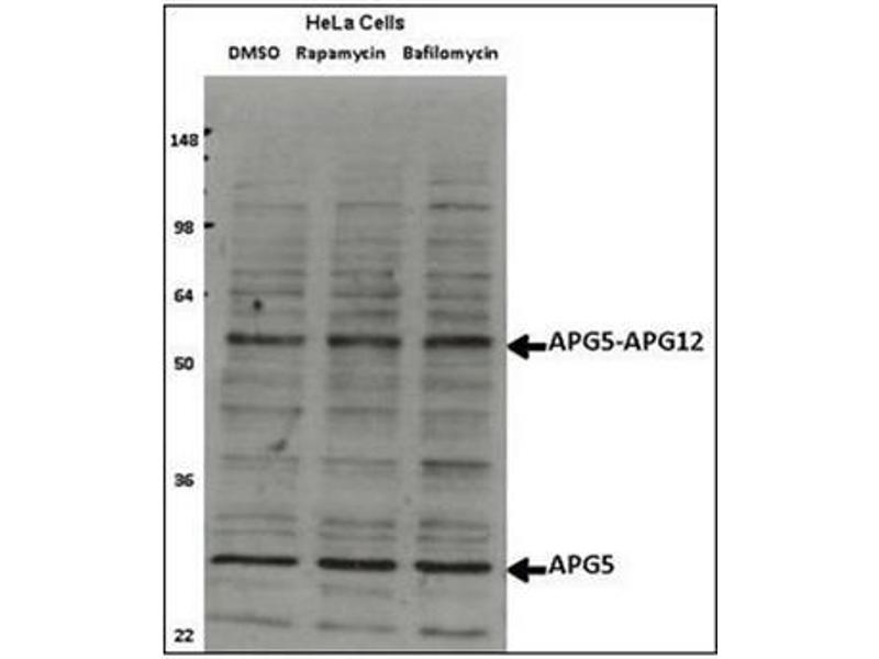 Macroautophagy is the major inducible pathway for the general turnover of cytoplasmic constituents in eukaryotic cells, it is also responsible for the degradation of active cytoplasmic enzymes and organelles during nutrient starvation. Macroautophagy involves the formation of double-membrane bound autophagosomes which enclose the cytoplasmic constituent targeted for degradation in a membrane bound structure, which then fuse with the lysosome (or vacuole) releasing a single-membrane bound autophagic bodies which are then degraded within the lysosome (or vacuole). APG5, required for autophagy, conjugates to ATG12 and associates with an isolation membrane to form a cup-shaped isolation membrane and autophagosome. The conjugate detaches from the membrane immediately before or after autophagosome formation is completed. APG5 may also play an important role in the apoptotic process, possibly within the modified cytoskeleton. Its expression is a relatively late event in the apoptotic process, occurring downstream of caspase activity.Synonyms: APG5-like, ASP, Apoptosis-specific protein, Autophagy protein 5