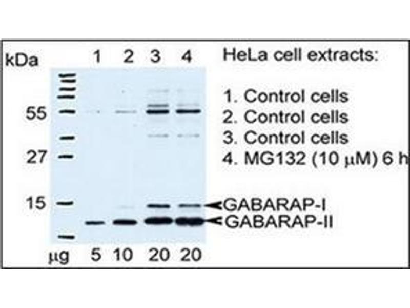 Gamma-aminobutyric acid A receptors [GABA(A) receptors] are ligand-gated chloride channels that mediate inhibitory neurotransmission. GABARAP is GABA(A) receptor-associated protein, which is highly positively charged in its N-terminus and shares sequence similarity with light chain-3 of microtubule-associated proteins 1A and 1B. This protein clusters neurotransmitter receptors by mediating interaction with the cytoskeleton.Synonyms: FLC3B, GABA Receptor Associated Protein, GABA(A) receptor-associated protein, Gamma-aminobutyric acid receptor-associated protein