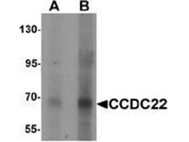 CCDC22 is a recently identified coiled-coil domain-containing protein that has been shown to bind copines, which are calcium-dependent, membrane-binding proteins that may function in calcium signaling. In rat, CCDC22 has been observed to localize in multiple regions of the brain, including the prefrontal and somatosensory cortex, dentate gyrus and thalamus, and in the ipsilateral motor neurons of the spinal cord after sciatic nerve transection suggesting that it may play a role in neuronal injury response. The human CCDC22 gene has been identified as a novel candidate gene for syndromic X-linked intellectual disability (XLID).Synonyms: CXorf37, Coiled-coil domain-containing protein 22