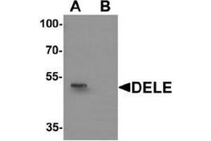 DELE is a recently identified DAP3-binding protein that is thought to be important in the induction of death receptor-mediated apoptosis. Transfected cells that stably express DELE were found to be susceptible to apoptosis induction by TNF-alpha and TRAIL, whereas reducing DELE expression by siRNA rescued these cells from apoptosis induction. Furthermore, the reduction of DELE expression also inhibited the activation of caspase-3, caspase-8 and caspase-9 following stimulation by TNF-alpha, anti-Fas, or TRAIL, indicating the importance of DELE in apoptosis mediated by death receptors.