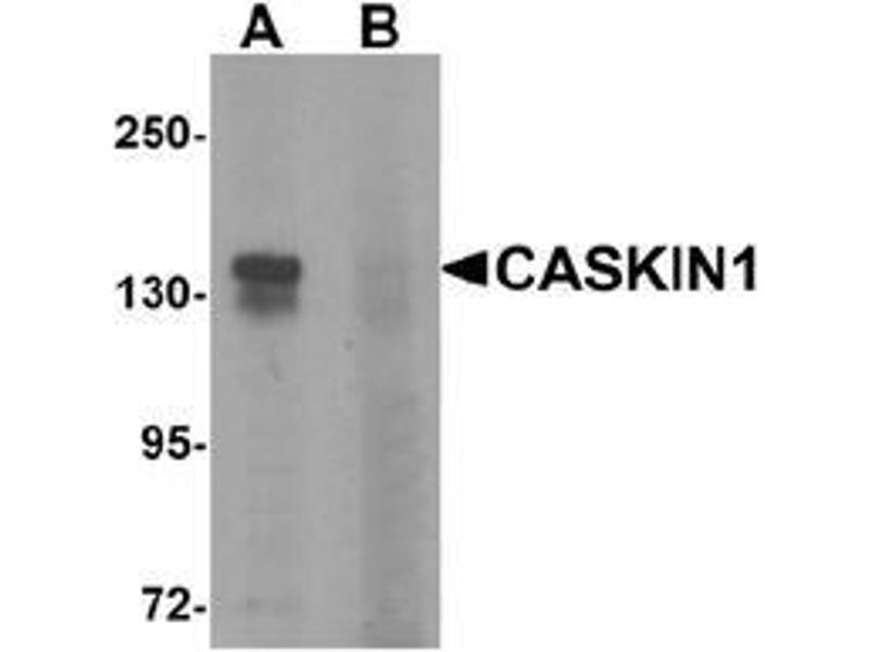 Calcium/calmodulin-dependent serine protein kinase (CASK) is a conserved multi-domain scaffolding protein involved in brain development, synapse formation, and establishment of cell polarity. CASKINs (CASK interacting proteins) interact with CASK and is thought to play a role in CASK function, specifically by coupling CASK to distinct downstream effectors. CASKIN1 is a multidomain protein containing six N-terminal ankyrin repeats, one SH3 domain, and two sterile alpha motif domains followed by a long proline-rich sequence and a short conserved C-terminal domain. CASKIN1 coassembles with CASK on the cytoplasmic tail of neurexin 1, suggesting that CASKIN and CASK coat the cytoplasmic tails of neurexins and other cell-surface proteins.Synonyms: ANKS5A, CASK interacting protein 1, Caskin-1