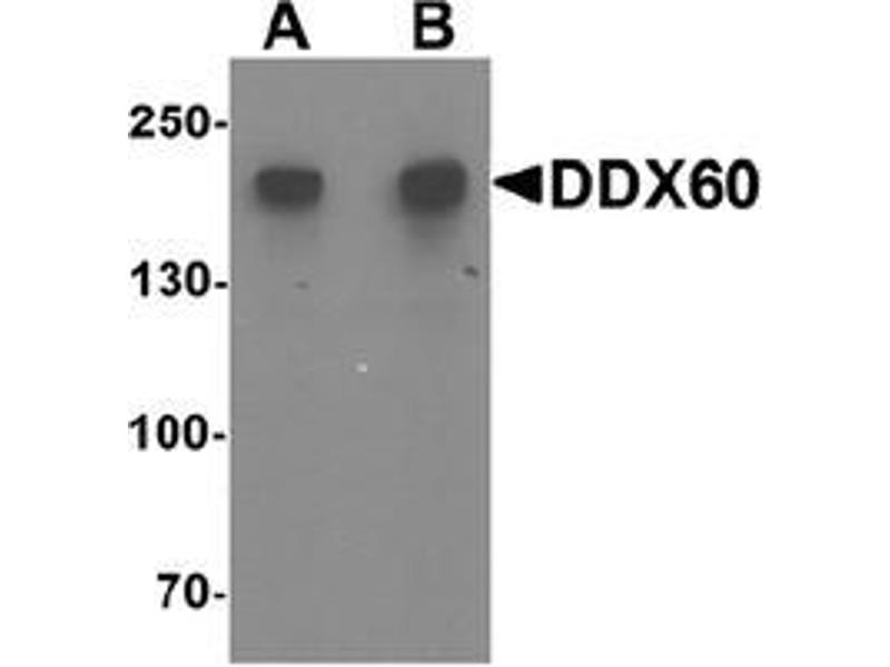 DDX60 is a DEXD/H Box RNA helicase and the human homolog of the S. cerevisiae Ski2, a cofactor of RNA exosome. Expression of DDX60 increases after viral infection and binds to endogenous RIG-I, a cytoplasmic viral RNA sensor, as well as other RIG-I-like receptors such as MDA5 and LGP2. These proteins activate TBK1 and IKK-e, signaling IRF3 and NF-kB-responsive genes in the innate immune response pathway. DDX60 is required for the RIG-I- or MDA5-dependent response to viral infection, but is dispensable for TLR3-mediated signaling.Synonyms: FLJ20035, Probable ATP-dependent RNA helicase DDX60