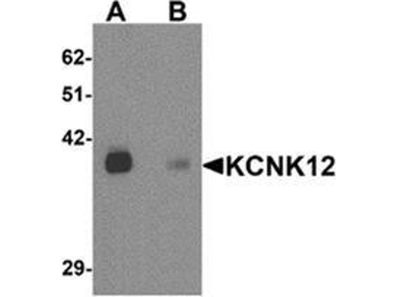 - KCNK13 and KCNK12 (also known as THIK1 and 2) are the first two members of a novel two pore-forming P domains K+ channels subfamily. The pore loop domain, a highly conserved region common to all potassium channels, is involved in determining potassium ion selectivity. Members of this family are all characterized by four transmembrane domains and may function to help influence the resting membrane potential of cells. KCNK12 is expressed mainly in the brain and lung, but also observed in the kidneys, heart and skeletal muscle. KCNK12 is closely related to KCNK13 (58 % identity at the amino acid level), but could not yet been functionally expressed in vitro and may require other proteins to become active.Synonyms: KCNK12, Potassium channel subfamily K member 12, THIK-2, Tandem pore domain halothane-inhibited potassium channel 2