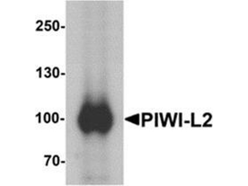 PIWI-L2 is a member of the PIWI subfamily of Argonaute proteins, evolutionarily conserved proteins containing both PAZ and Piwi motifs that are crucial for the biogenesis and function of small non-coding RNAs and play important roles in stem cell self-renewal, RNA silencing, and translational regulation in diverse organisms. PIWI-L2 has been implicated in multiple roles including stem cell self-renewal and is highly expressed in many breast cancers. In these tumors, PIWI-L2 silences the expression of STAT3, a regulator of Bcl-XL and cyclin D1, allowing the proliferation and survival of breast cancer stem cells. Recent studies have shown that overexpression of PIWI-like proteins are potential biomarkers for colon and other cancers.Synonyms: CT80, Cancer/testis antigen 80, HILI, Hiwi-like, Mili, Miwi-like, PIWIL1L, Piwi-like protein 2