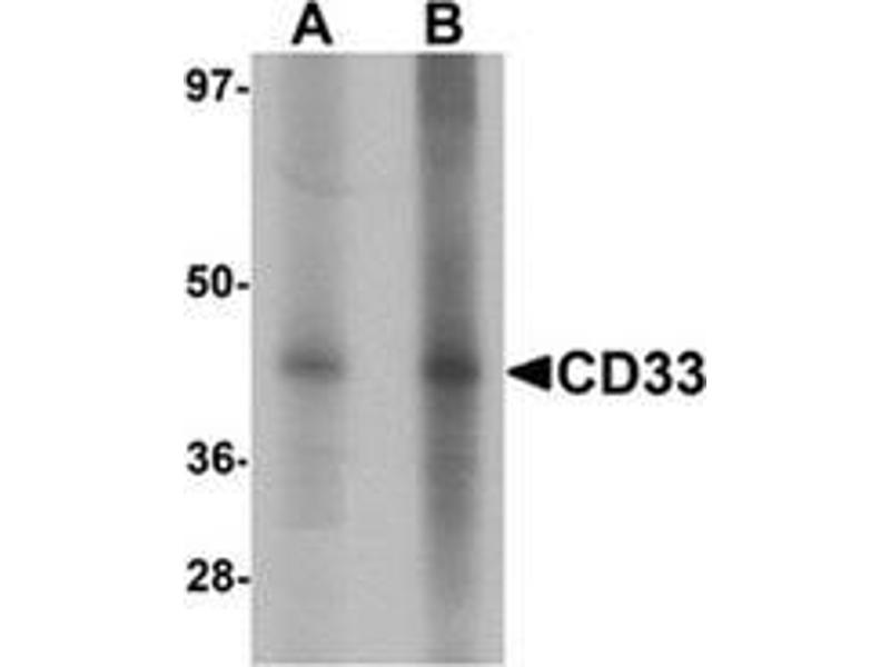 CD33 antibody can be used for detection of CD33 by Western blot at 1 - 2 μg/mL.