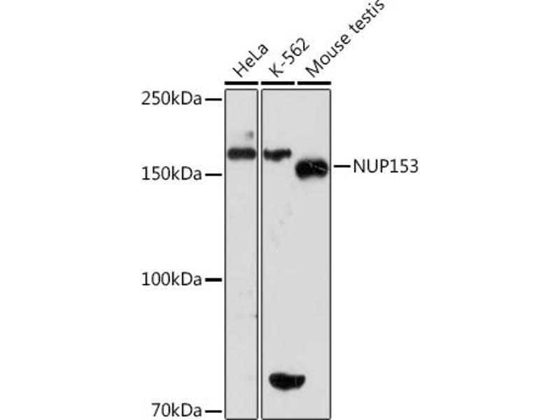 Nuclear pore complexes regulate the transport of macromolecules between the nucleus and cytoplasm. They are composed of at least 100 different polypeptide subunits, many of which belong to the nucleoporin family. Nucleoporins are glycoproteins found in nuclear pores and contain characteristic pentapeptide XFXFG repeats as well as O-linked N-acetylglucosamine residues oriented towards the cytoplasm. The protein encoded by this gene has three distinct domains: a N-terminal region containing a pore targeting and an RNA-binding domain domain, a central region containing multiple zinc finger motifs, and a C-terminal region containing multiple XFXFG repeats. Alternative splicing results in multiple transcript variants of this gene. [provided by RefSeq, May 2013],HNUP153, N153,Epigenetics & Nuclear Signaling,Nuclear Receptor Signaling,Signal Transduction,NUP153