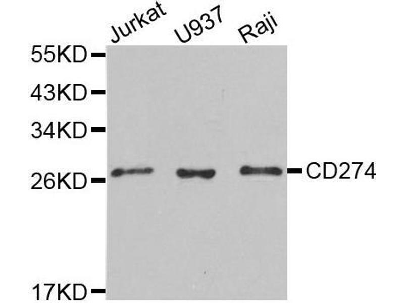 This gene encodes an immune inhibitory receptor ligand that is expressed by hematopoietic and non-hematopoietic cells, such as T cells and B cells and various types of tumor cells. The encoded protein is a type I transmembrane protein that has immunoglobulin V-like and C-like domains. Interaction of this ligand with its receptor inhibits T-cell activation and cytokine production. During infection or inflammation of normal tissue, this interaction is important for preventing autoimmunity by maintaining homeostasis of the immune response. In tumor microenvironments, this interaction provides an immune escape for tumor cells through cytotoxic T-cell inactivation. Expression of this gene in tumor cells is considered to be prognostic in many types of human malignancies, including colon cancer and renal cell carcinoma. Alternative splicing results in multiple transcript variants.,B7-H,B7H1,PDL1,PD-L1,PDCD1L1,PDCD1LG1,CD274,Immunology & Inflammation,CD markers,PD-L1