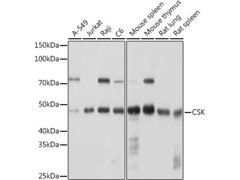 - Non-receptor tyrosine-protein kinase that plays an important role in the regulation of cell growth, differentiation, migration and immune response. Phosphorylates tyrosine residues located in the C-terminal tails of Src-family kinases (SFKs including LCK, SRC, HCK, FYN, LYN, CSK or YES1. Upon tail phosphorylation, Src-family members engage in intramolecular interactions between the phosphotyrosine tail and the SH2 domain that result in an inactive conformation. To inhibit SFKs, CSK is recruited to the plasma membrane via binding to transmembrane proteins or adapter proteins located near the plasma membrane. Suppresses signaling by various surface receptors, including T-cell receptor (TCR and B-cell receptor (BCR by phosphorylating and maintaining inactive several positive effectors such as FYN or LCK.,CSK, tyrosine-protein kinase CSK,B Cell Receptor Signaling Pathway,Immunology & Inflammation,Kinase,Kinase_Tyrosine kinases,Signal Transduction,CSK