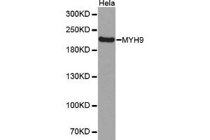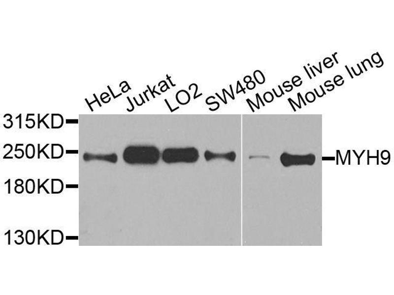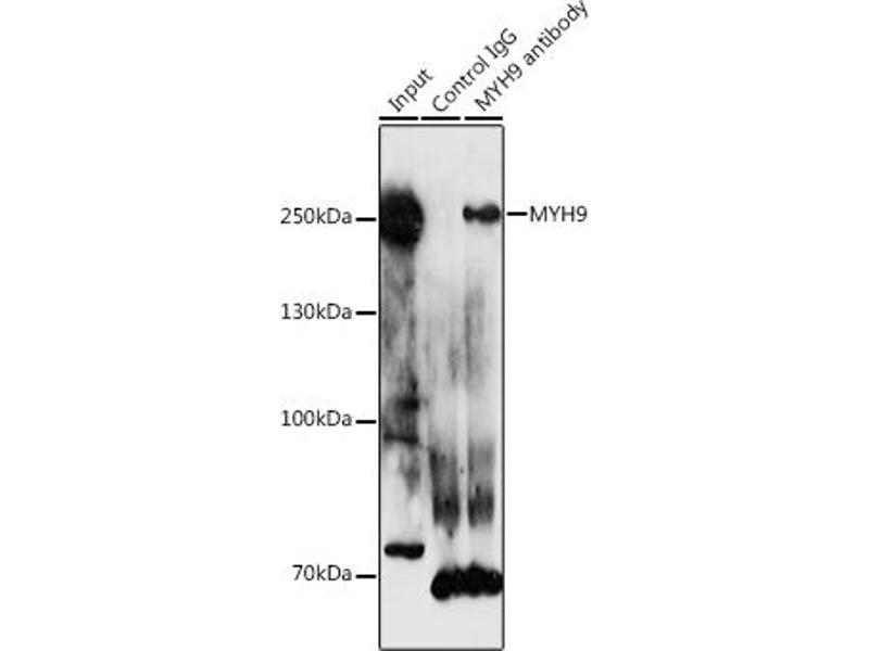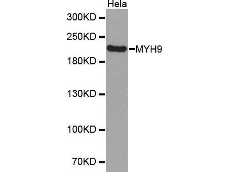 This gene encodes a conventional non-muscle myosin, this protein should not be confused with the unconventional myosin-9a or 9b (MYO9A or MYO9B). The encoded protein is a myosin IIA heavy chain that contains an IQ domain and a myosin head-like domain which is involved in several important functions, including cytokinesis, cell motility and maintenance of cell shape. Defects in this gene have been associated with non-syndromic sensorineural deafness autosomal dominant type 17, Epstein syndrome, Alport syndrome with macrothrombocytopenia, Sebastian syndrome, Fechtner syndrome and macrothrombocytopenia with progressive sensorineural deafness.,MYH9,BDPLT6,DFNA17,EPSTS,FTNS,MHA,NMHC-II-A,NMMHC-IIA,NMMHCA,myosin-9,Signal Transduction,Cell Biology & Developmental Biology,Cytoskeleton,Motor Proteins,MYH9