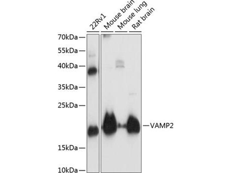 The protein encoded by this gene is a member of the vesicle-associated membrane protein (VAMP)/synaptobrevin family. Synaptobrevins/VAMPs, syntaxins, and the 25-kD synaptosomal-associated protein SNAP25 are the main components of a protein complex involved in the docking and/or fusion of synaptic vesicles with the presynaptic membrane. This gene is thought to participate in neurotransmitter release at a step between docking and fusion. The protein forms a stable complex with syntaxin, synaptosomal-associated protein, 25 kD, and synaptotagmin. It also forms a distinct complex with synaptophysin. It is a likely candidate gene for familial infantile myasthenia (FIMG) because of its map location and because it encodes a synaptic vesicle protein of the type that has been implicated in the pathogenesis of FIMG.,VAMP2,SYB2,VAMP-2,Cancer,Signal Transduction,Endocrine & Metabolism,Neuroscience,Cell Type Marker,Neuron marker,Synapse marker,VAMP2