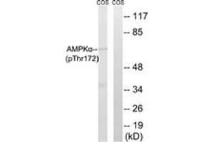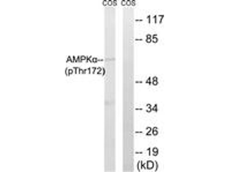 AMPK alpha (Phospho-Thr172) Antibody detects endogenous levels of AMPK alpha only when phosphorylated at Thr172.