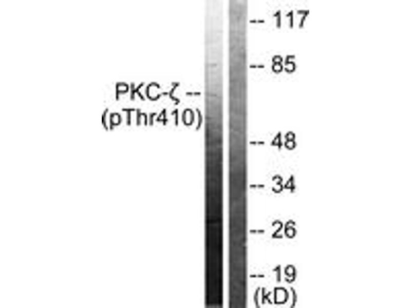 PKC zeta (Phospho-Thr410) Antibody detects endogenous levels of PKC zeta only when phosphorylated at Thr410.