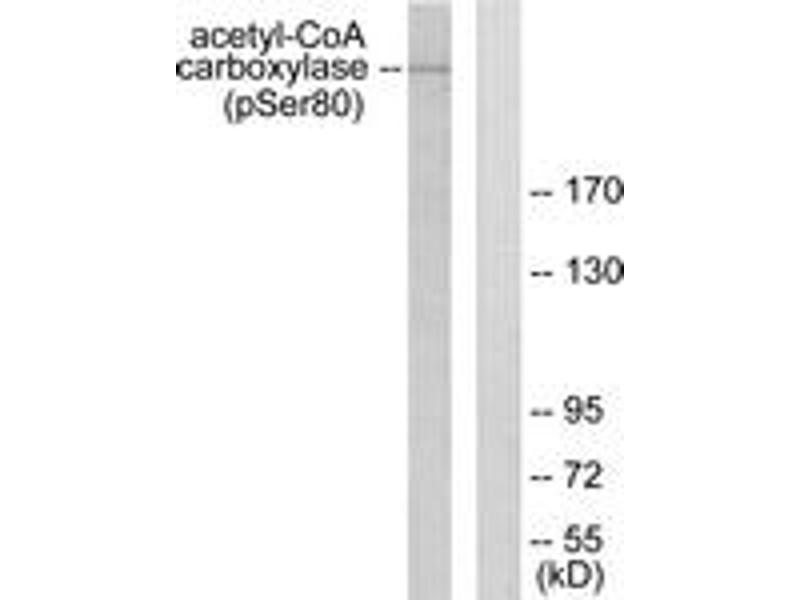 Acetyl-CoA Carboxylase (Phospho-Ser80) Antibody detects endogenous levels of Acetyl-CoA Carboxylase only when phosphorylated at Ser80.