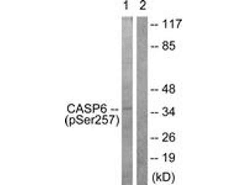 Caspase 6 (Phospho-Ser257) Antibody detects endogenous levels of Caspase 6 only when phosphorylated at Ser257.