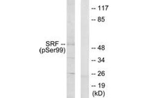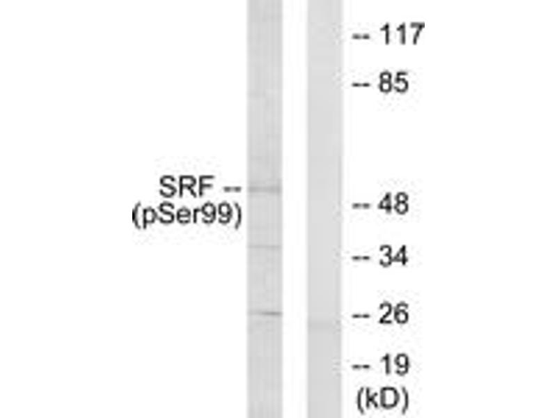 SRF (Phospho-Ser99) Antibody detects endogenous levels of SRF only when phosphorylated at Ser99.