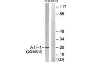 ATF1 (Phospho-Ser63) Antibody detects endogenous levels of ATF1 only when phosphorylated at Ser63.