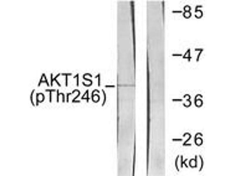 Akt1 S1 (Phospho-Thr246) Antibody detects endogenous levels of Akt1 S1 only when phosphorylated at Thr246.