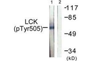 Lck (Phospho-Tyr505) Antibody detects endogenous levels of Lck only when phosphorylated at Tyr505.