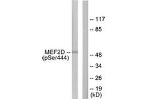 MEF2D (Phospho-Ser444) Antibody detects endogenous levels of MEF2D only when phosphorylated at Ser444.