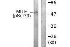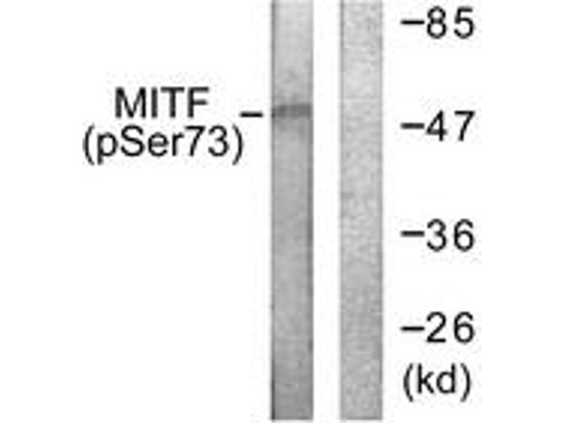 MITF (Phospho-Ser180/73) Antibody detects endogenous levels of MITF only when phosphorylated at Ser180/73.