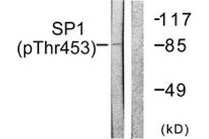 SP1 (Phospho-Thr453) Antibody detects endogenous levels of SP1 only when phosphorylated at Thr453.
