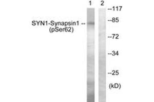 Synapsin1 (Phospho-Ser62) Antibody detects endogenous levels of Synapsin1 only when phosphorylated at Ser62.
