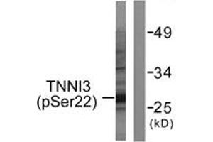 TNNI3 (Phospho-Ser22+Ser23) Antibody detects endogenous levels of TNNI3 only when phosphorylated at Ser22 and Ser23.
