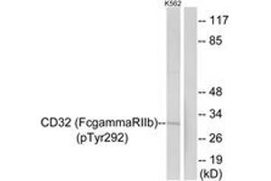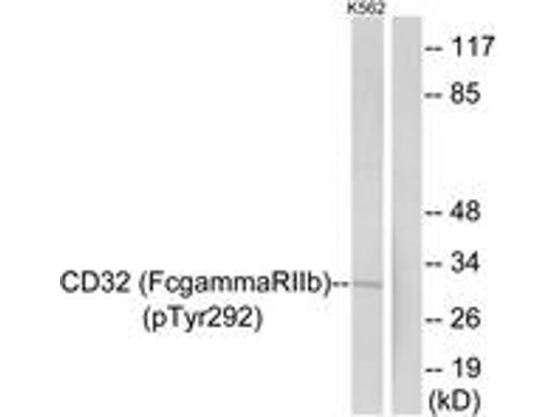 CD32 (Phospho-Tyr292) Antibody detects endogenous levels of CD32 only when phosphorylated at Tyr292.