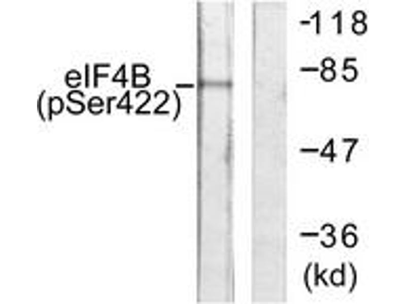 eIF4B (Phospho-Ser422) Antibody detects endogenous levels of eIF4B only when phosphorylated at Ser422.