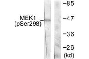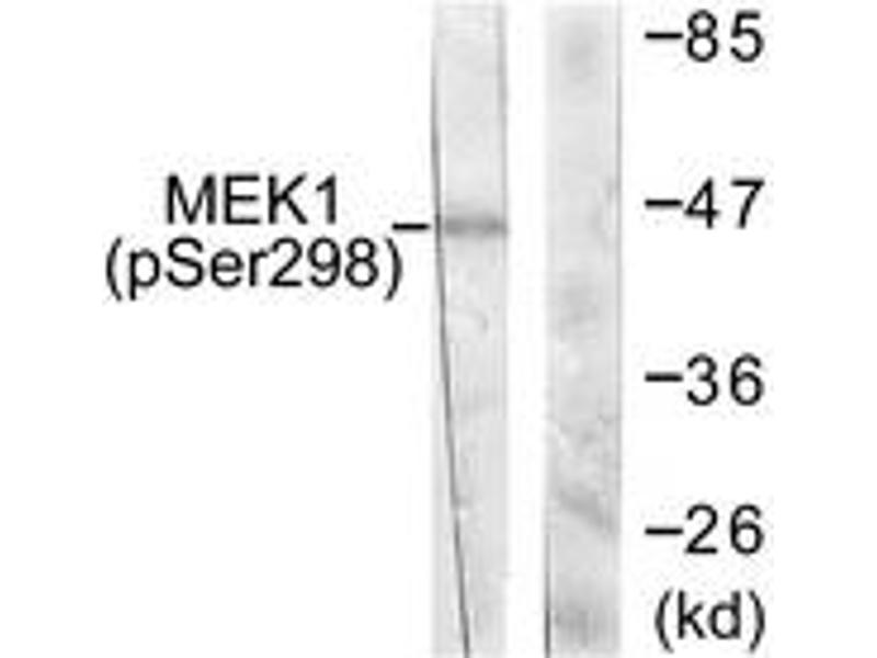 MEK1 (Phospho-Ser298) Antibody detects endogenous levels of MEK1 only when phosphorylated at Ser298.