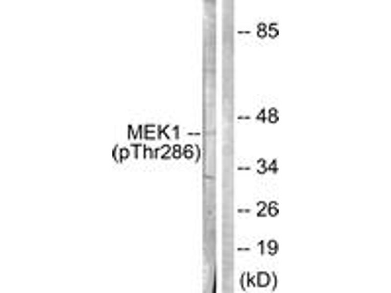 MEK1 (Phospho-Thr286) Antibody detects endogenous levels of MEK1 only when phosphorylated at Thr286.