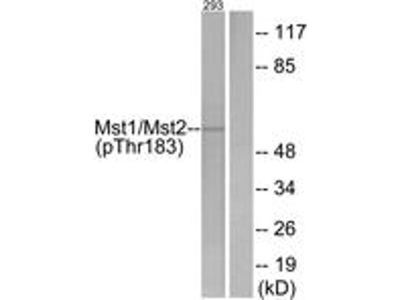 Mst1/2 (Phospho-Thr183) Antibody detects endogenous levels of Mst1/2 only when phosphorylated at Thr183.
