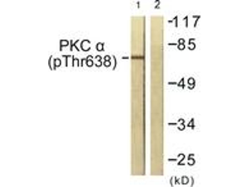 PKC alpha (Phospho-Thr638) Antibody detects endogenous levels of PKC alpha only when phosphorylated at Thr638.