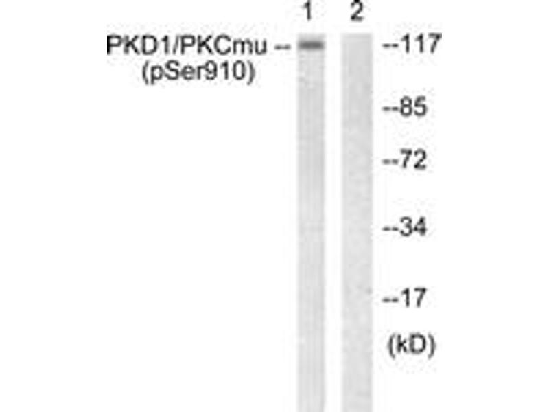 PKD1/PKC mu (Phospho-Ser910) Antibody detects endogenous levels of PKD1/PKC mu only when phosphorylated at Ser910.