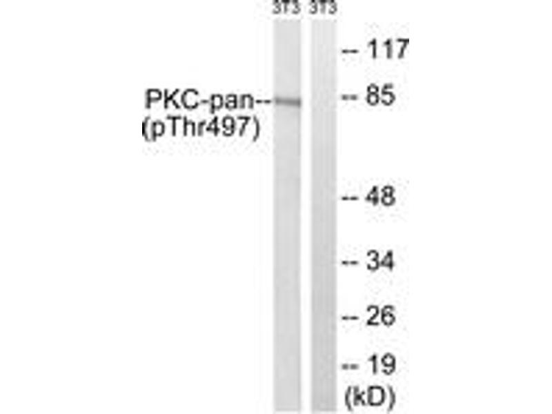 PKC-pan (Phospho-Thr497) Antibody detects endogenous levels of PKC-pan only when phosphorylated at Thr497.
