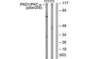 PKD1/PKC mu (Phospho-Ser205) Antibody detects endogenous levels of PKD1/PKC mu only when phosphorylated at Ser205.