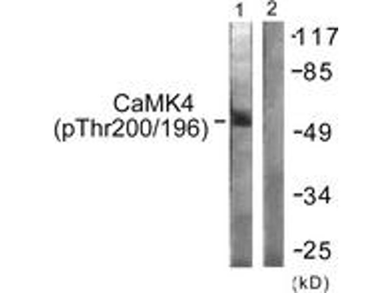 CaMK4 (Phospho-Thr196/200) Antibody detects endogenous levels of CaMK4 only when phosphorylated at Thr196/200.