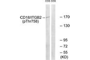 CD18/ITGB2 (Phospho-Thr758) Antibody detects endogenous levels of CD18/ITGB2 only when phosphorylated at Thr758.