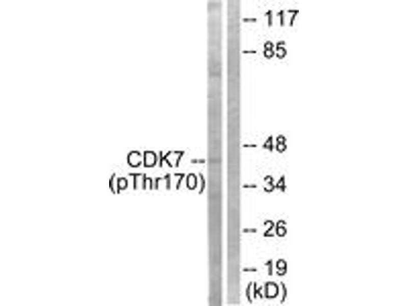 CDK7 (Phospho-Thr170) Antibody detects endogenous levels of CDK7 only when phosphorylated at Thr170.