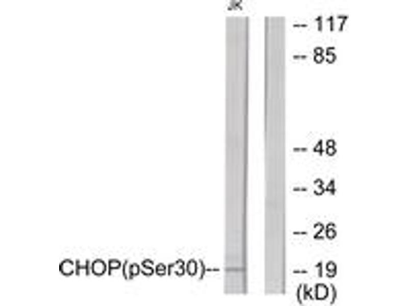 CHOP (Phospho-Ser30) Antibody detects endogenous levels of CHOP only when phosphorylated at Ser30.