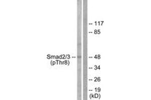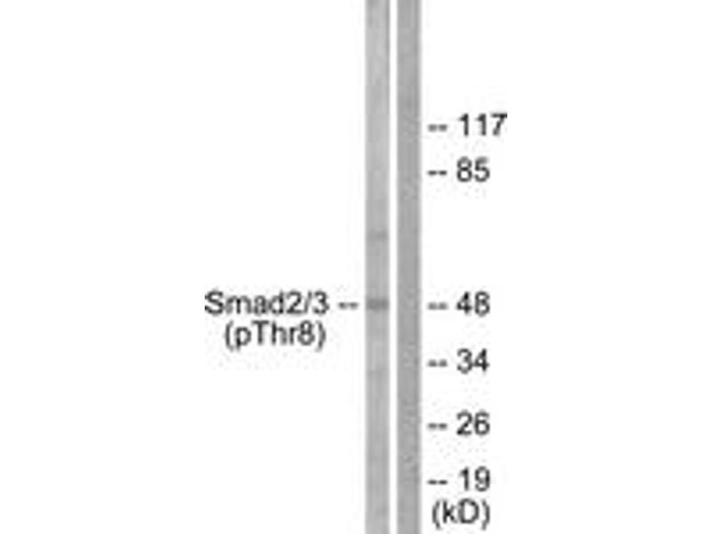 Smad2/3 (Phospho-Thr8) Antibody detects endogenous levels of Smad2/3 only when phosphorylated at Thr8.